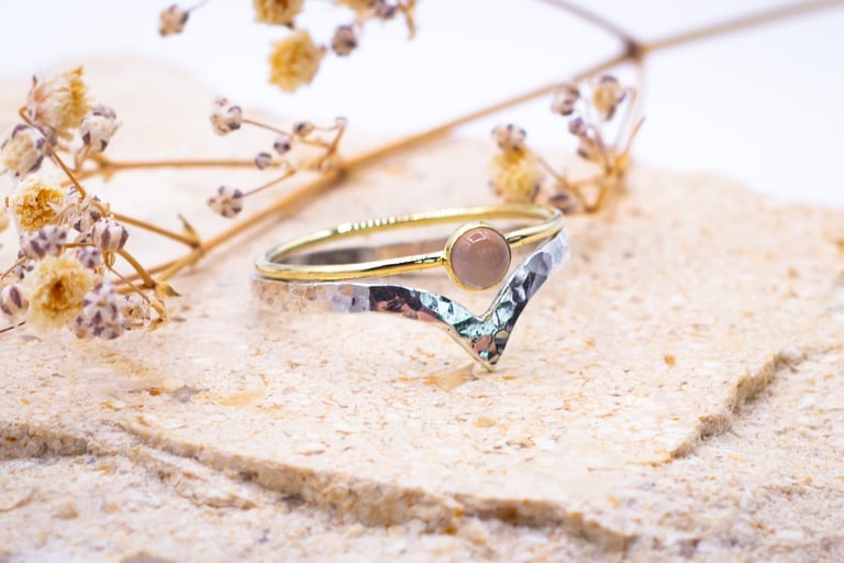 Andere combinaties: bredere gehamerde zilveren ring, dunnere gouden zetting, verschillende steenvormen.
