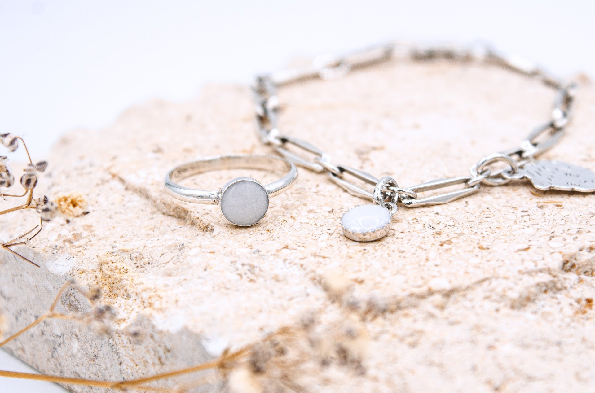 Een moedermelk ring witgoud is een verfijnd en modern sieraad dat persoonlijke betekenis en luxe moeiteloos combineert. Witgoud heeft een heldere, zilverachtige glans die prachtig samengaat met de zachte kleur van geconserveerde moedermelk. Dit edelmetaal is geliefd om zijn stijlvolle en tijdloze uitstraling, en vormt een duurzame basis voor een ring die je een leven lang met trots kunt dragen. Bij Zeev Atelier wordt elke moedermelk ring witgoud met de hand gemaakt, volledig afgestemd op jouw wensen, met bijvoorbeeld een geboortesteen, haarlokje of gravure als extra persoonlijk detail.